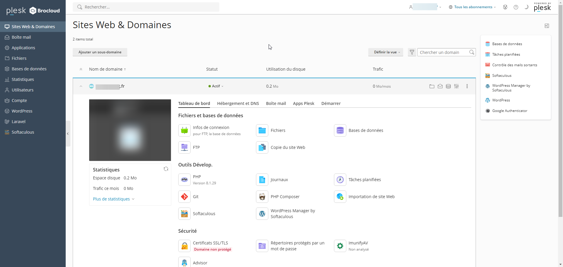 Plesk est l’interface de gestion intuitive et ergonomique qui vous permet de gérer l’ensemble des services rattachés à votre hébergement web.