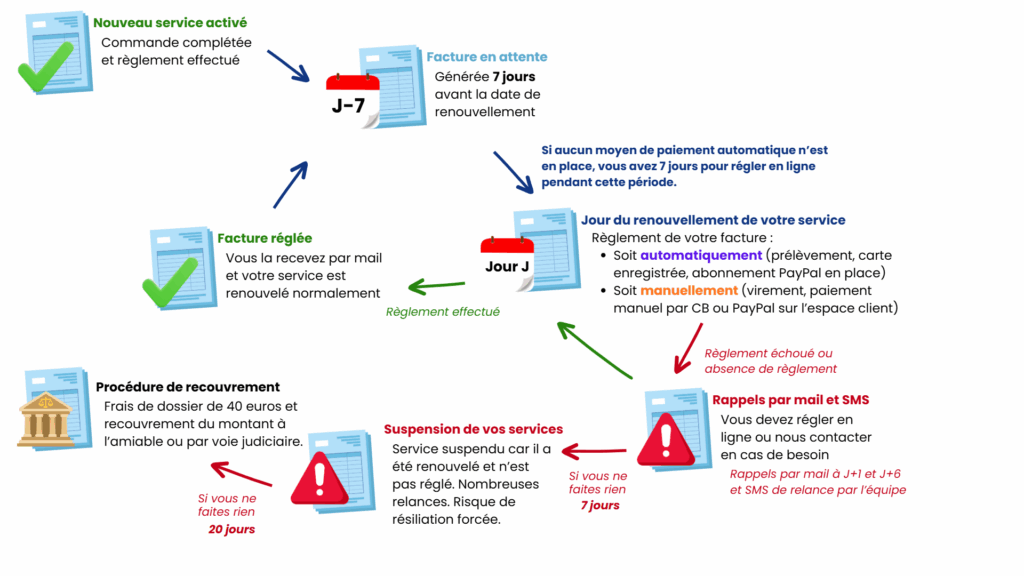 Date de facturation : 7 jours avant la date de renouvellement du service.